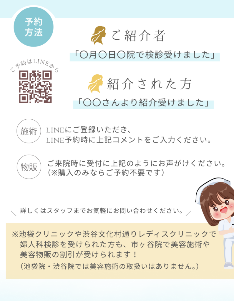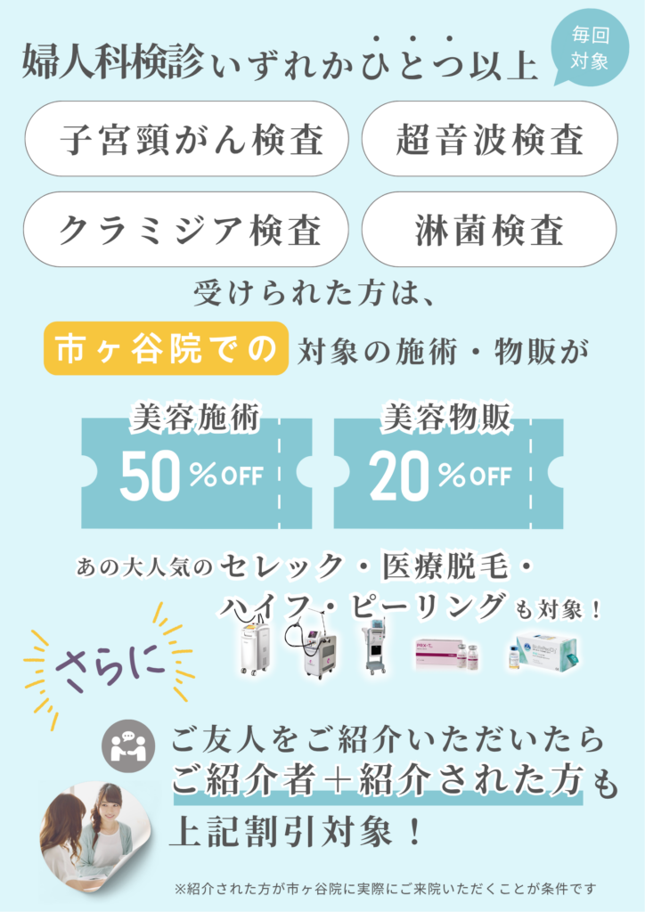 婦人科検診・紹介割などのお得なキャンペーンもございますので、ぜひ一度ご利用ください。
